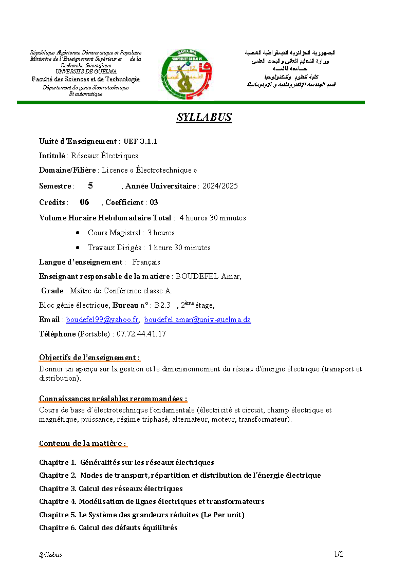 Donner un aperçu sur la gestion et le dimensionnement du réseau d'énergie électrique (transport et distribution).