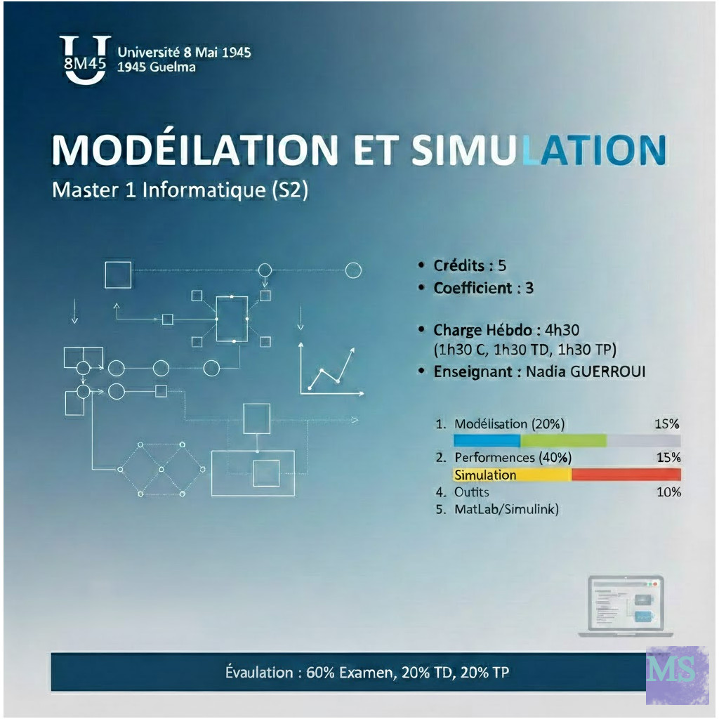 Le module de Modélisation et Simulation s'inscrit dans le programme de Master 1 en Informatique (Semestre 2) avec une charge horaire hebdomadaire de 4h30, répartie équitablement entre cours, travaux dirigés et travaux pratiques.Cette unité d'enseignement (coefficient 3, 5 crédits) vise à doter les étudiants de compétences approfondies pour l'analyse et l'évaluation des performances des systèmes informatiques complexes. L'objectif pédagogique central est de maîtriser le passage du système réel à un modèle abstrait, puis de valider ce modèle par des techniques de simulation numérique.