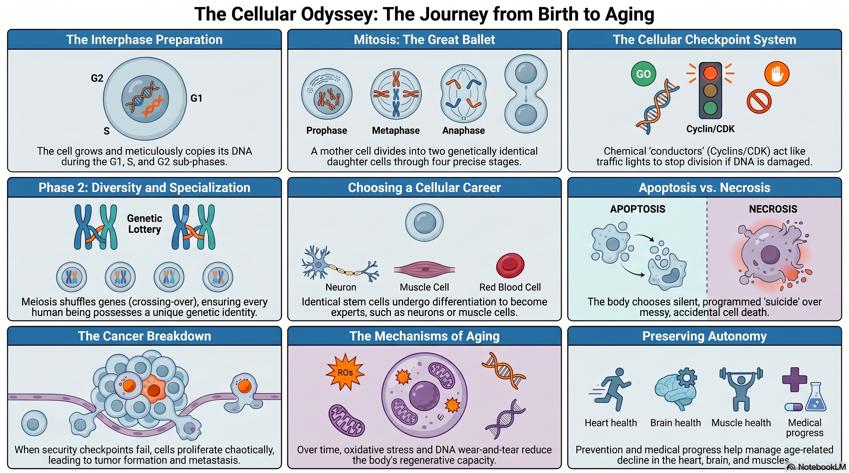 Ce document est une véritable plongée au cœur du vivant. Il explore en profondeur notre biologie cellulaire, notre génétique et notre physiologie en racontant l'histoire fascinante de nos cellules : de leur naissance à leur mort. Il met surtout en lumière la façon dont ces minuscules événements microscopiques impactent notre corps tout entier, que ce soit à travers le processus naturel du vieillissement ou l'apparition de maladies comme le cancer.