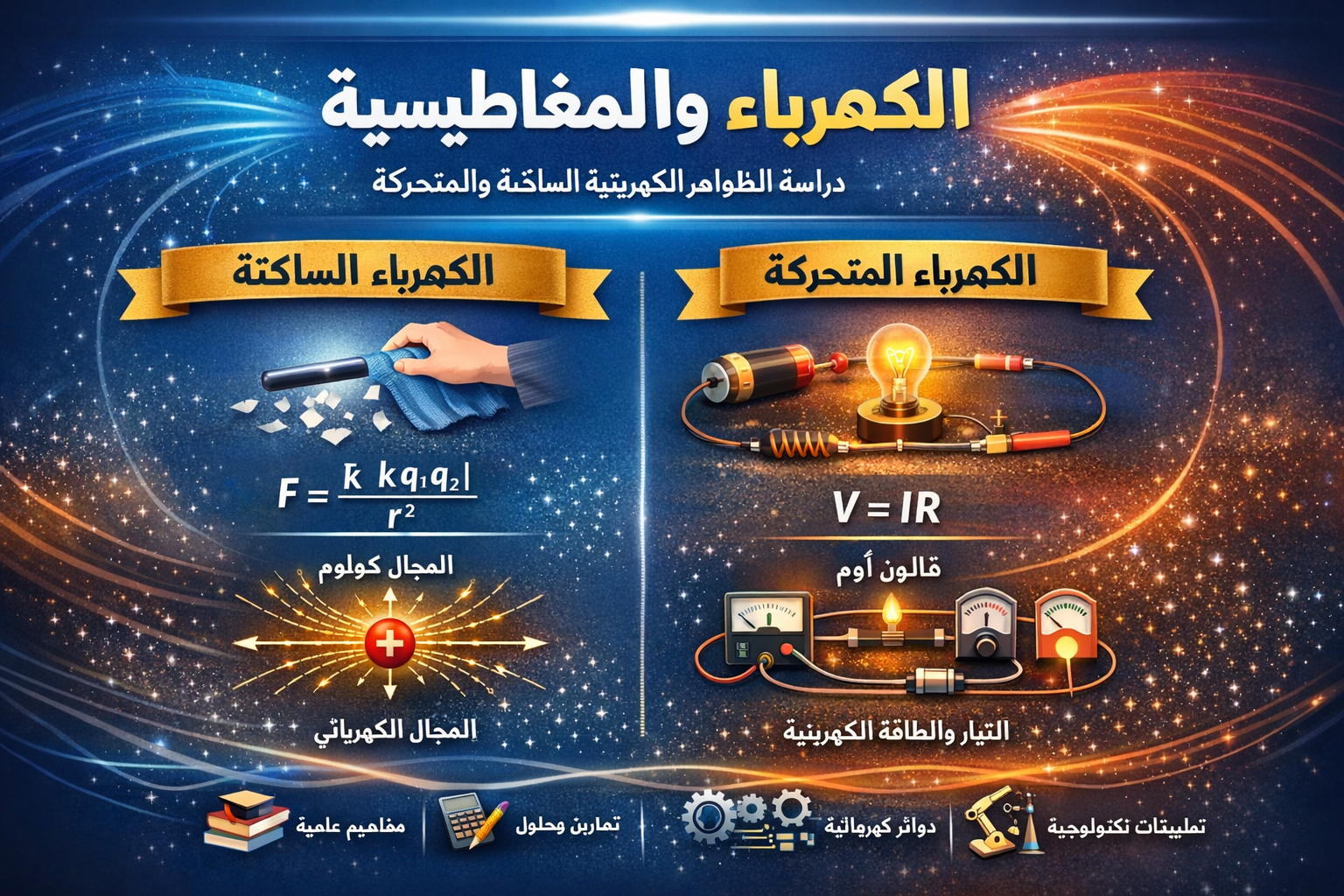 يتناول مقياس الكهرباء والمغناطيسية دراسة الكهرباء الساكنة والكهرباء المتحركة، حيث تُعنى الكهرباء الساكنة بدراسة الشحنات في حالة السكون، وطرق التكهرب، وقانون كولوم، والمجال الكهربائي، بينما تختص الكهرباء المتحركة بدراسة انتقال الشحنات داخل النواقل، والتيار الكهربائي، وقانون أوم، والطاقة والاستطاعة الكهربائية، والدوائر الكهربائية البسيطة. يهدف هذا المقياس إلى تمكين الطالب من فهم الظواهر الكهربائية الأساسية، وتحليل الدارات، وحل المشكلات الفيزيائية المرتبطة بها، وربط المفاهيم النظرية بالتطبيقات التكنولوجية الحديثة.
